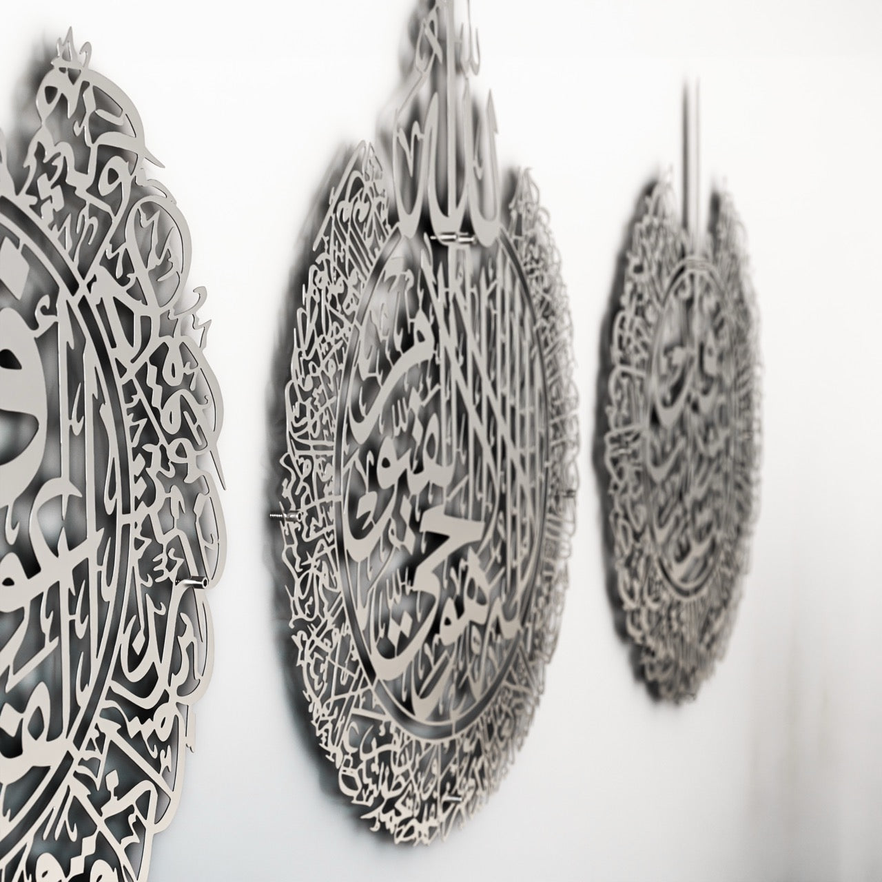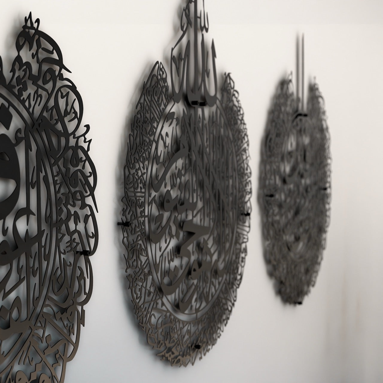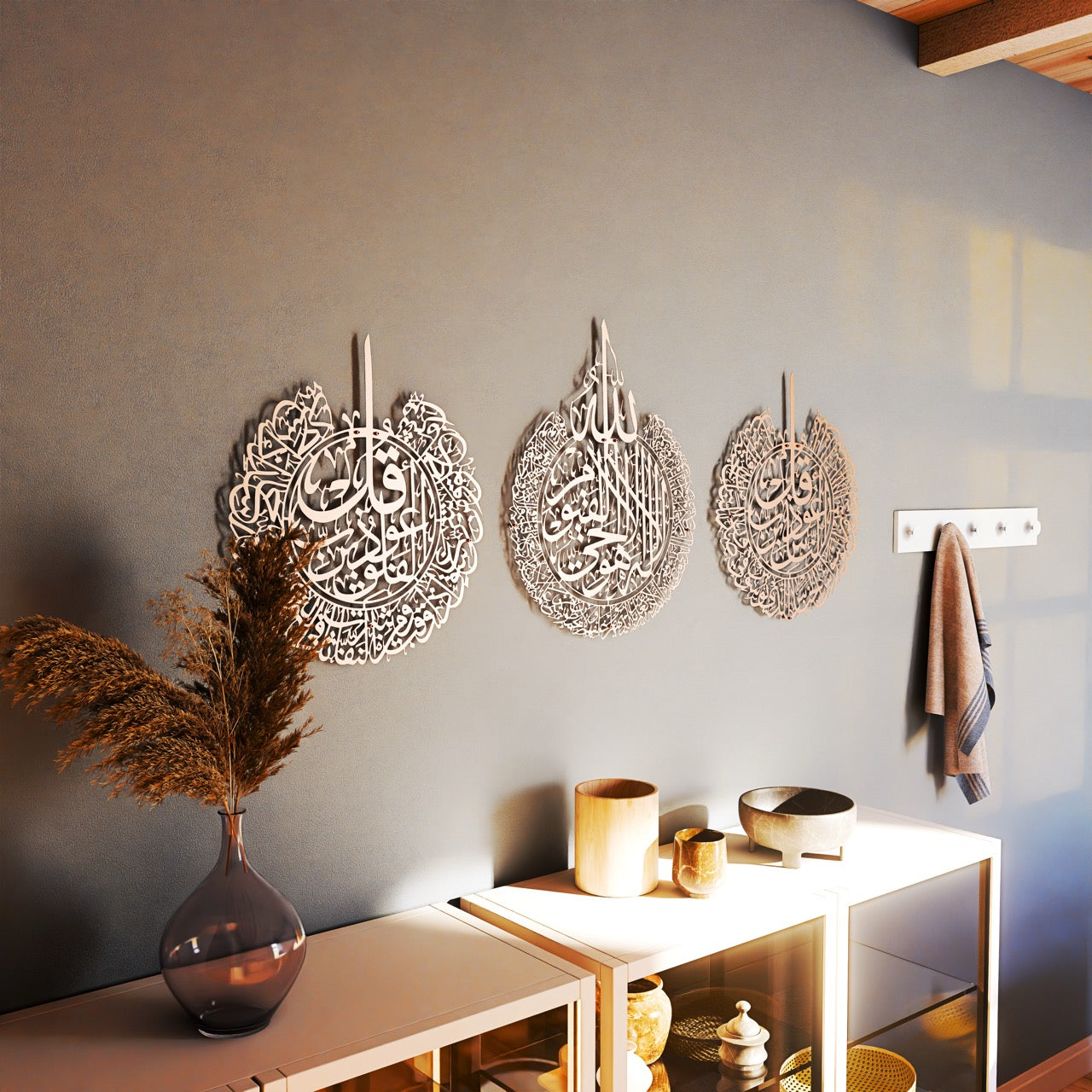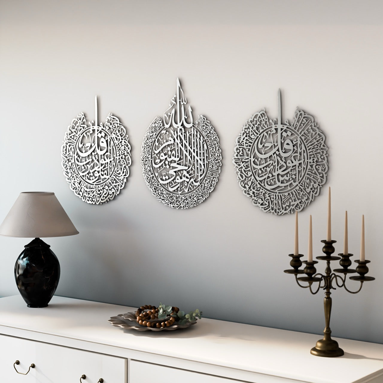 These verses, known for their protective guidance, are beautifully rendered in metal, offering a timeless addition to any Islamic home decor. Ideal as a Muslim gift, this collection not only adorns your walls but serves as a daily reminder of divine sanctuary, making it a pivotal piece of Quran wall art for those who cherish Islamic art and decor. Enhance your Ramadan decorations and celebrate Eid Mubarak with a touch of elegance that resonates with faith and tradition. This set is also an ideal Ramadan decor for your walls. See other Islamic Metal Wall Decor by clicking here!