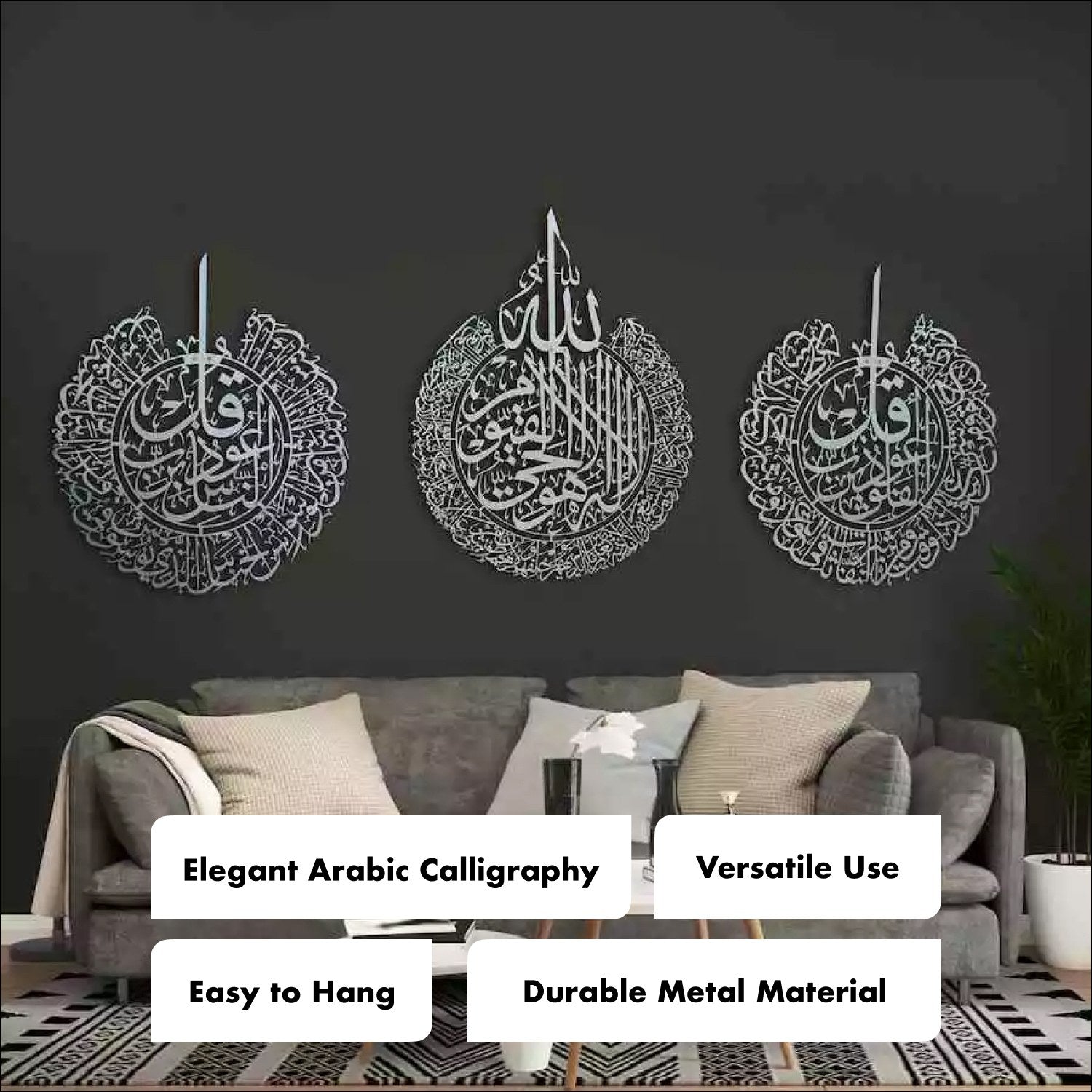 Dive into the rich tapestry of faith with our exquisite Set of Ayatul Kursi, Surah Al Falaq, and Surah An Nas Metal Islamic Wall Art, a masterpiece that intertwines Islamic calligraphy with deep spiritual narratives.