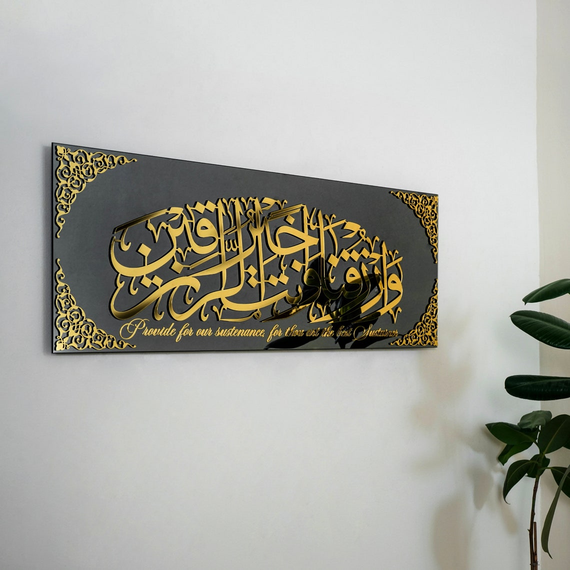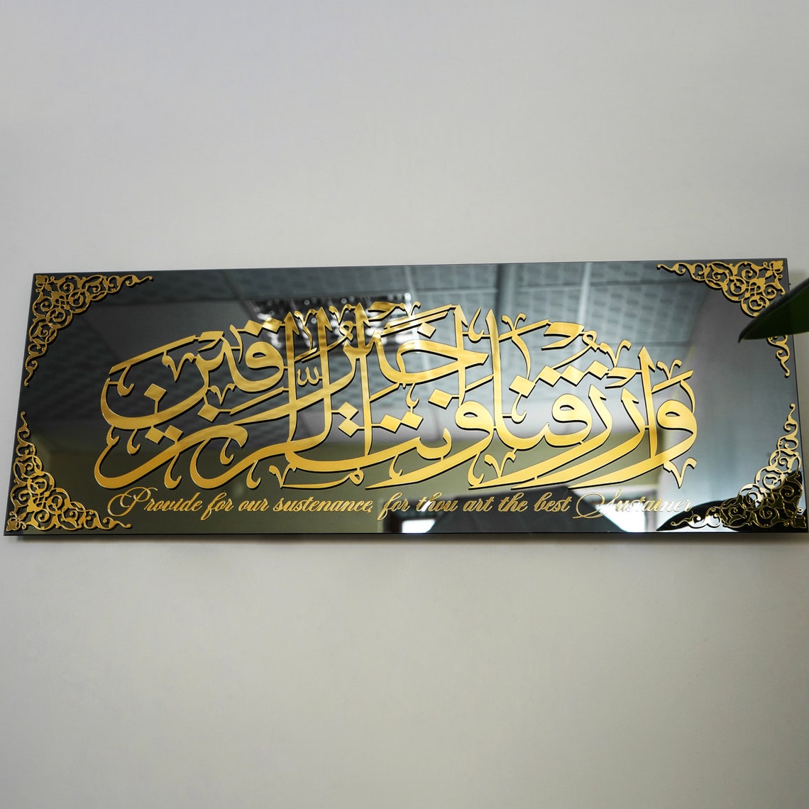 This piece beautifully captures the essence of the dua for sustenance, a prayer that symbolizes faith in Allah's provision, depicted in intricate Islamic calligraphy. A profound element of Islamic home decor, it enriches your space with the spiritual depth of Quran wall art. Ideal as a meaningful accent for Ramadan decor, it also resonates beautifully during Eid Mubarak, capturing the true spirit of Islamic art and decor. See other Glass Islamic Home Decors by clicking here!