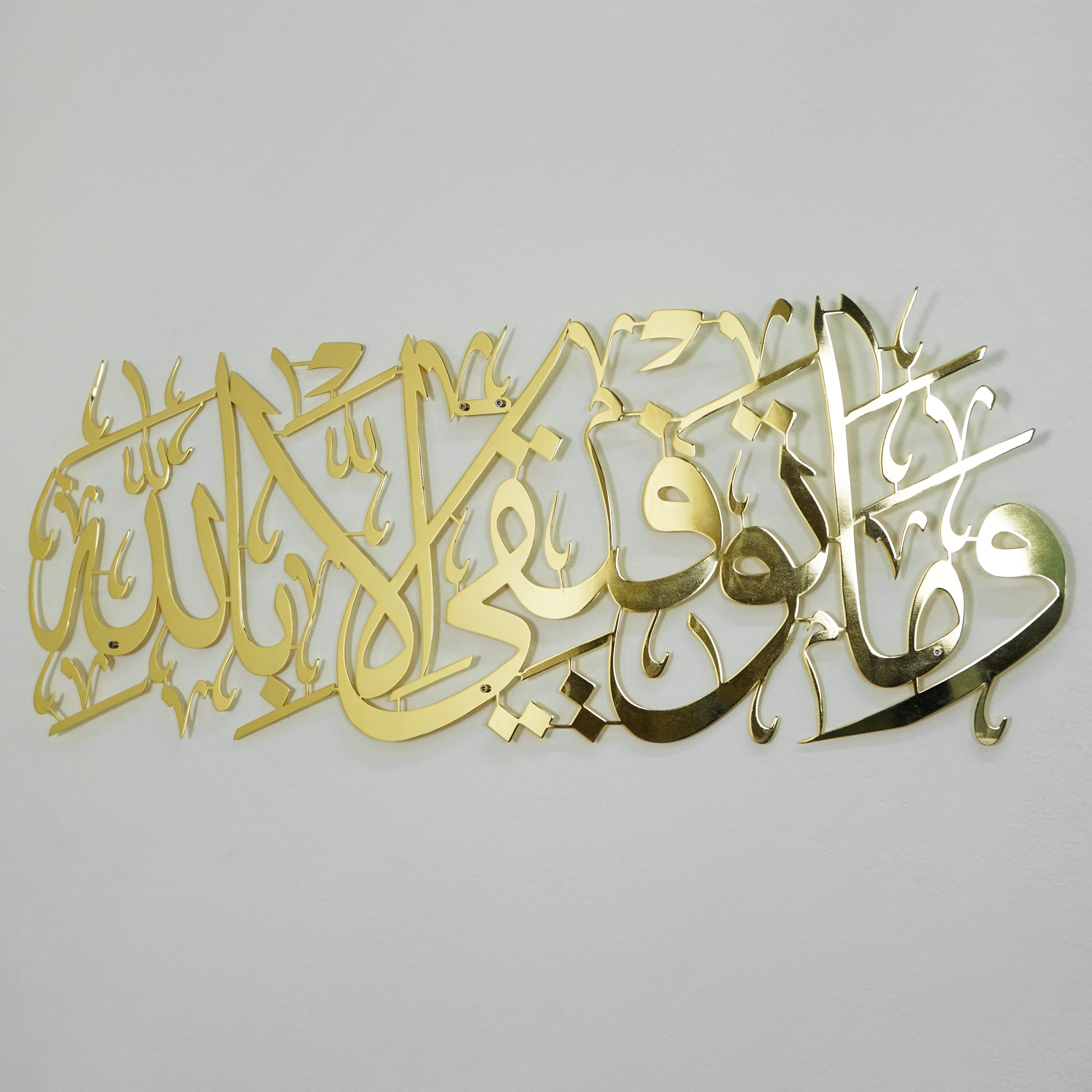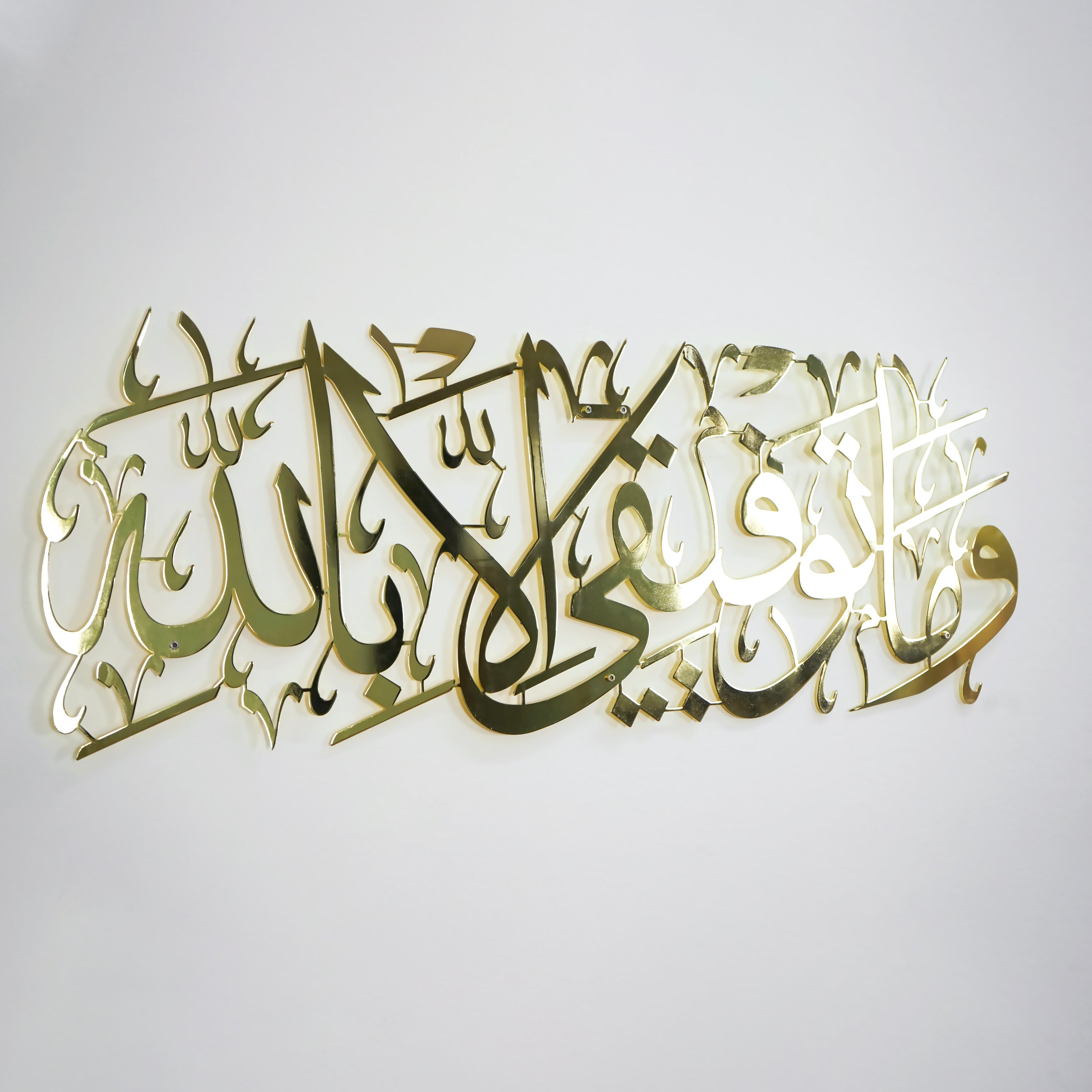 In this metal wall art, a phrase is written, which is a section from the 88th Verse of the Surah Hud and is also used as the "Dua for Success".This large metal wall art is not only a captivating piece of decor but also a spiritual emblem, crafted to bring serenity and reflection into your living room. The art piece combines the beauty of Quran wall art with the durability of metal, ensuring it stands as a lasting addition to your space. Our Islamic wall decor enhances any area it adorns, offering both aesthetic pleasure and a meaningful connection to your faith. Perfect for those who appreciate Islamic culture, this elegant artwork serves as a constant reminder of spiritual wisdom and artistic heritage. See other Metal Islamic Wall Decors by clicking here!
