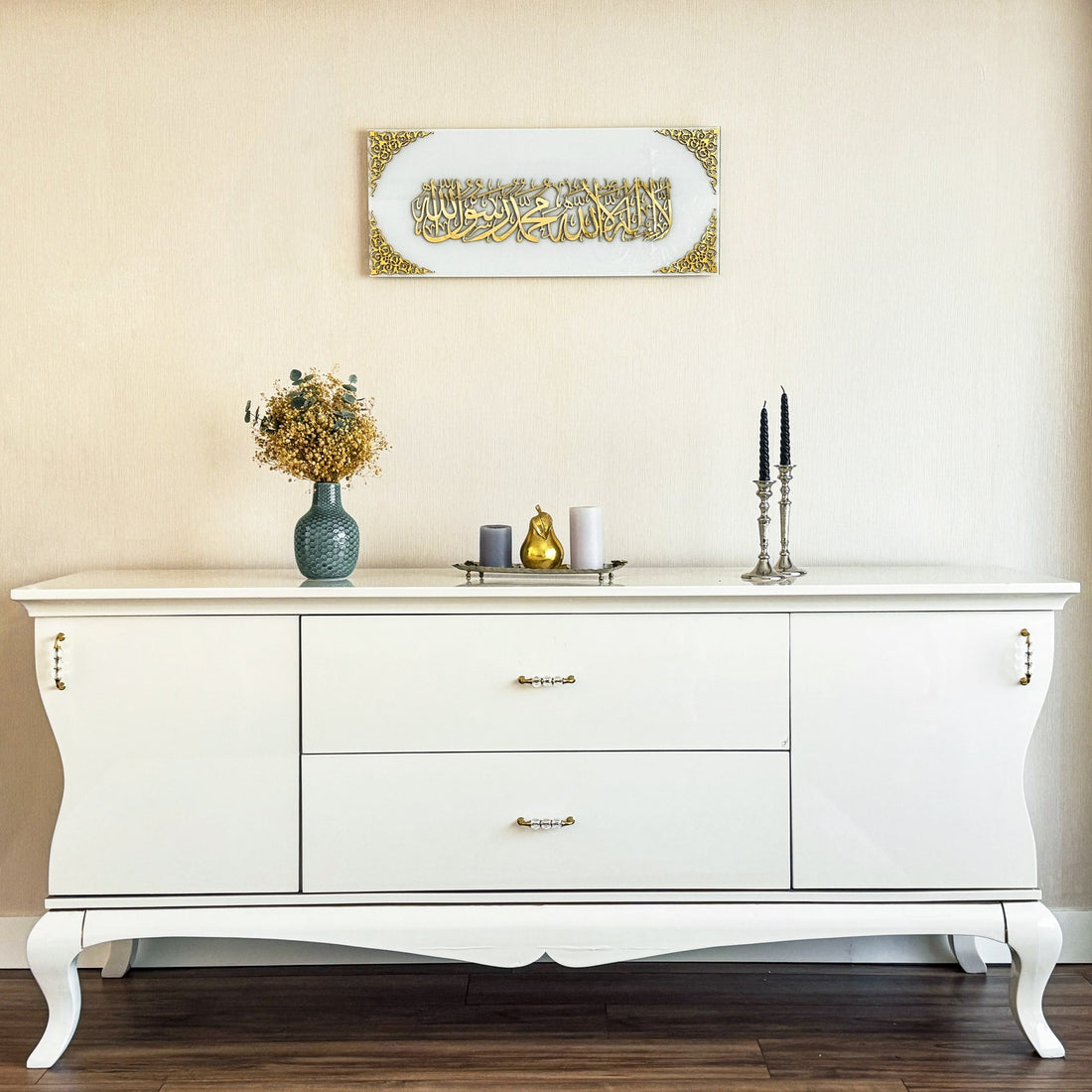 Adorn your sacred spaces with the serene beauty of the First Kalima, elegantly captured in our Horizontal Tempered Glass Islamic Wall Art Decor.