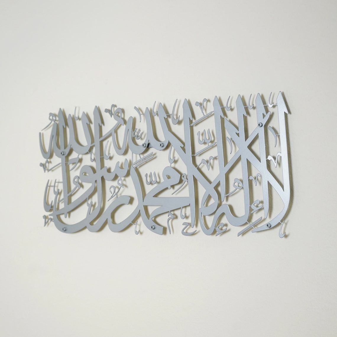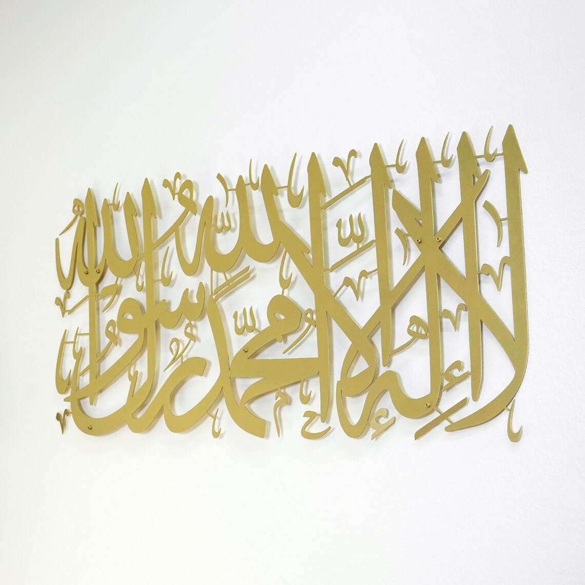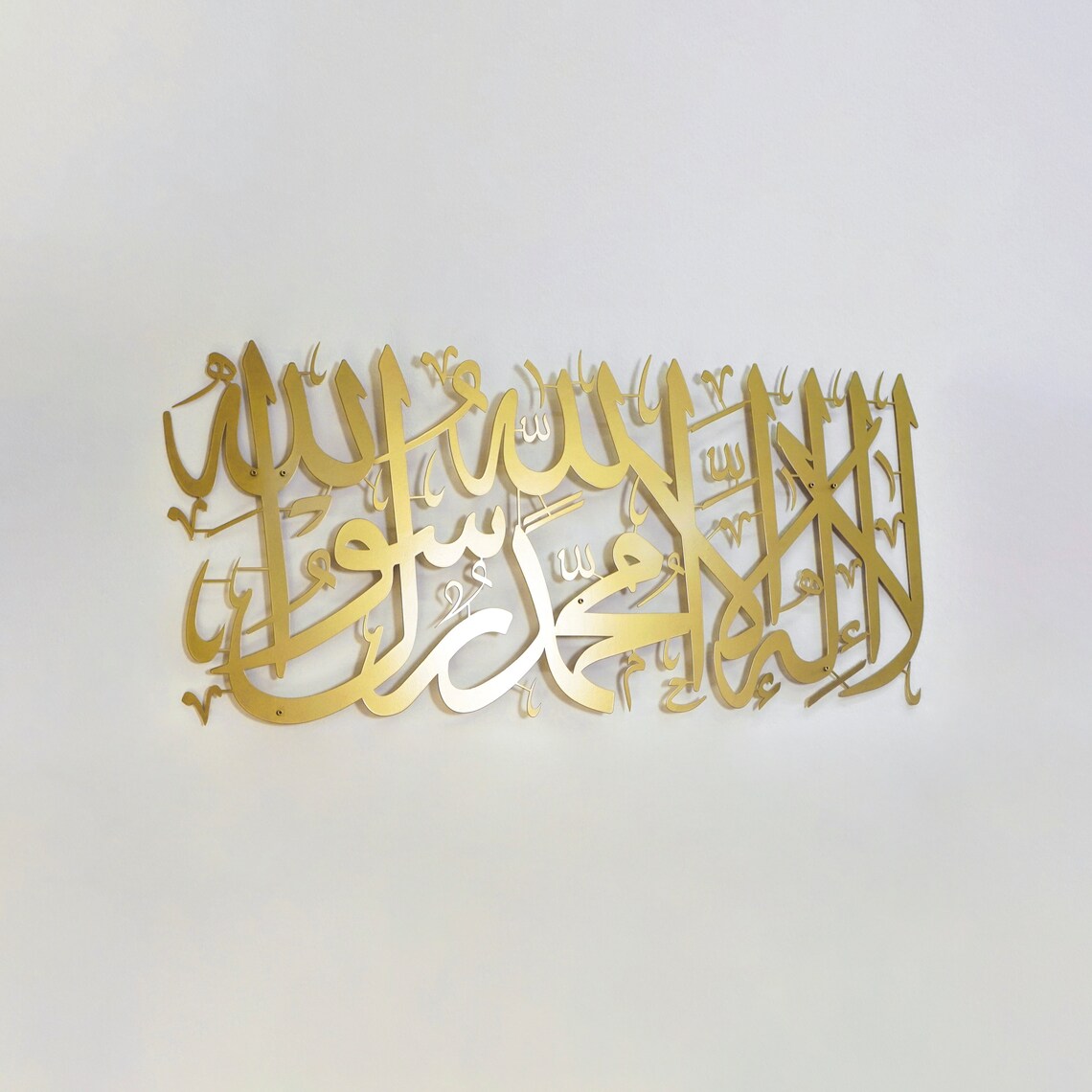 Adorned with the First Kalima "There is no God but Allah, and Muhammad is His Messenger" in horizontal Islamic calligraphy, this wall decoration symbolizes both unity and eternity in Islamic culture. Ideal for Ramadan Decor, Eid Mubarak or as a thoughtful Muslim gift, it will enhance any home with its beautiful Islamic design. See other Metal Islamic Wall Decors by clicking here!